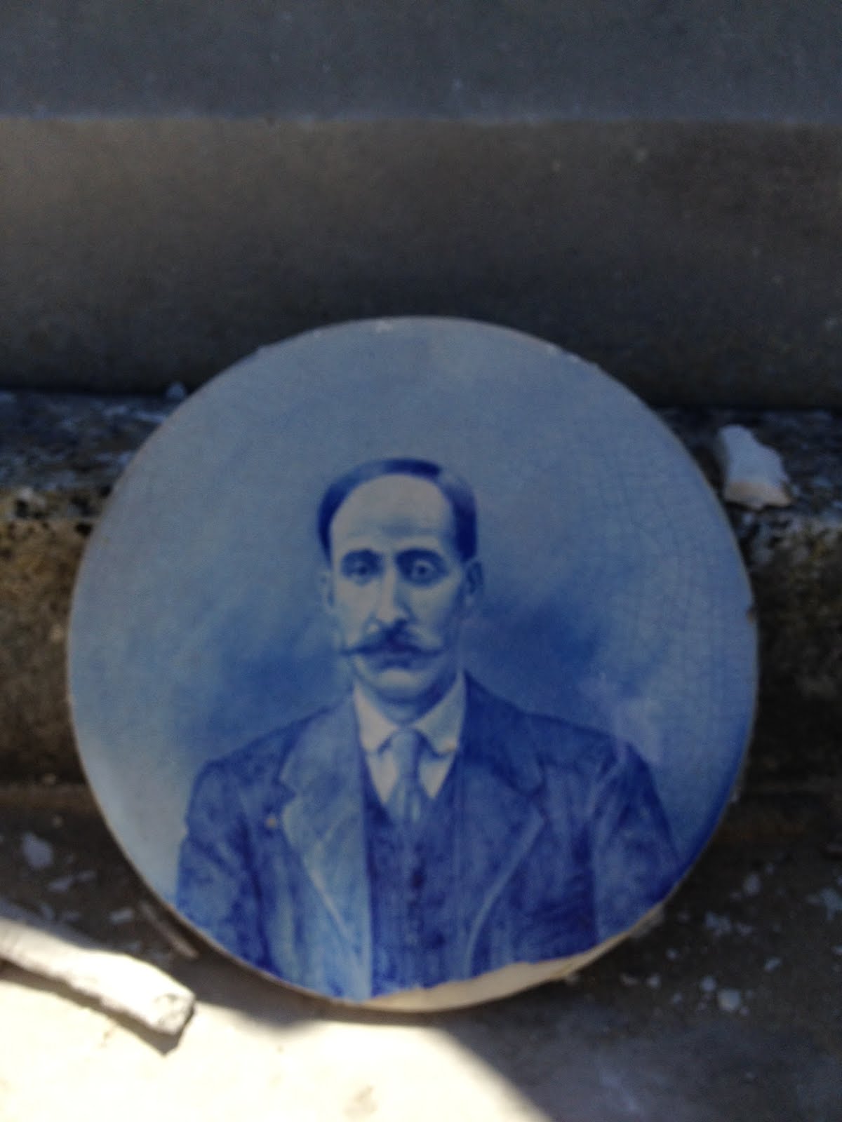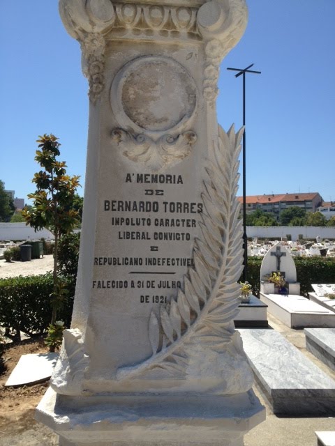 O Quarto da República". Um pequeno episódio, um entre muitos que vou colecionando com enorme prazer. Hoje sentei-me no mesmo sítio, um pouco mais cedo do que é habitual. Pensei, o meu colega louco ainda não chegou, às tantas não vai aparecer. Desliguei-me desta ideia e pus-me a ler, gozando a saborosa brisa. Eis que, silenciosamente, ao contrário da semana passada, apareceu o meu colega de escrita, transportando a sua velha pasta de cabedal, boné e uma gravata muito garrida. Entrou no cemitério. Fui atrás dele para ver o que ia fazer. Espirrou alto e em bom som acompanhado de um sonoro porra! estou constipado ou quê? Para em frente de uma campa cheia de flores, testemunha de um funeral recente. Olha, torna a olhar, cheira, torna a cheirar, sai mais um espirro valente e remata, hum, aqui houve funeral, pois houve, sim senhor. Calado, olha com muita atenção e eu não consegui descortinar o que é que se estaria a passar naquela mente. Começa a andar em passado acelerado, e aí vai ele ao longo dos corredores mortuários como se fosse um fiscal dos mortos. Sem parar, cabeça baixa, ia-se tornando cada vez mais pequeno naquela imensidão do vazio Fiquei a olhá-lo à distância. Fiz os cálculos, ainda vai demorar um bocado, vou-me embora, são quase horas de retomar a minha atividade. Passei por um talhão de antigos combatentes, olhei para as campas aquecidas pelo sol, ornamentadas por diferentes tipos de cruzes, até que me chamou a atenção um túmulo encimado por uma chama. Aproximei-me e comecei a examinar aquele pequeno monumento erigido à memória de Bernardo Torres. Desconhecia na altura quem teria sido, mas, pelos dizeres desenhados, "impoluto caráter, liberal convicto e republicano indefectível", conclui estar perante um pensador livre com atuação cívica importante na cidade. Falecido a 21 de julho de 1921. Na coluna há um espaço para um medalhão, mas estava vazio. Olhei para a base e descortinei na base uma interessante figura em cerâmica praticamente intacta, embora nos bordos houvesse alguma perda de substância. Teria caído sem se fragmentar. Estava ali à minha disposição. Peguei no medalhão e contemplei-o. Belo, sem dúvida. A figura impressionou-me, e fiquei com curiosidade em saber quem teria sido esta personalidade. Fiz umas breves pesquisas e concluí que foi uma notável figura de Aveiro, presidente da câmara, administrador de jornais, filantropo, em suma, alguém que em tempos terá contribuído para a sociedade. Imagino quantas palavras, quantos discursos e quantos elogios lhe foram dirigidos, para não falar das juras em perpetuar a sua memória como exemplo aos futuros cidadãos. Coloquei novamente o medalhão no chão, embora me apetecesse recolocá-lo no sítio devido.
